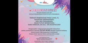 Pekanbaru - Mall SKA Pekanbaru resmi menghentikan operasional mall sementara mulai dari tanggal 26 Juli 2021 hingga 8 Agustus 2021.