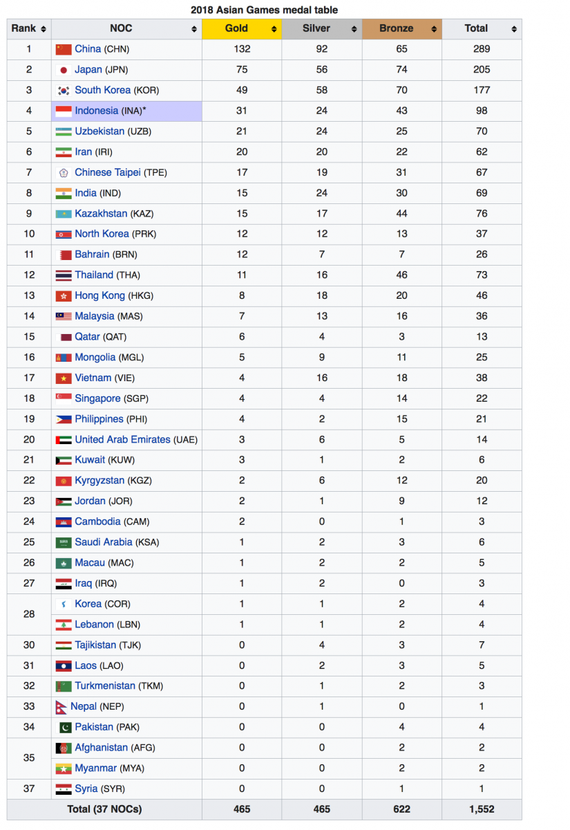 Di posisi ketiga ada Korea Selatan dengan total 177 medali, rinciannya 49 emas, 58 perak, dan 70 perunggu. Sementara, Indonesia finis keempat dan tidak lebih baik dari saat terakhir jadi tuan rumah tahun 1962, finis posisi kedua.