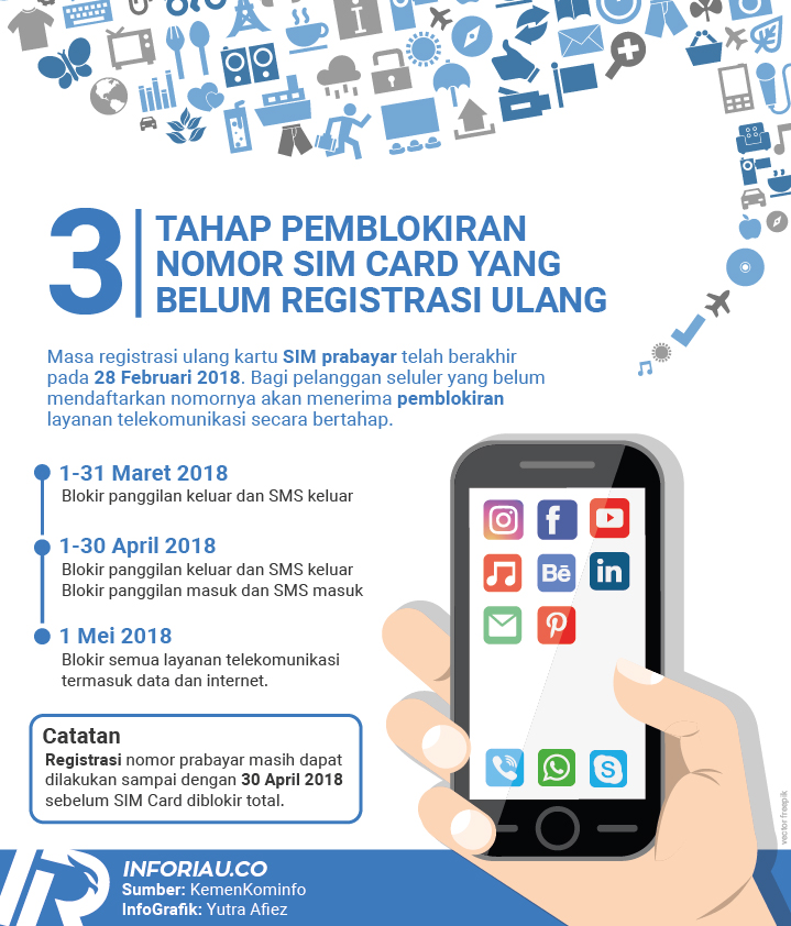 JAKARTA, INFORIAU.co - Per 1 Maret 2018, pemblokiran bertahap terhadap nomor SIM card prabayar yang belum registrasi ulang sudah mulai dijalankan oleh Kementerian Komunikasi dan Informatika (Kemkominfo) beserta para operator seluler yang ada di Indonesia. Tahap awal, para pelanggan itu tidak akan bisa melakukan panggilan telepon dan SMS keluar mulai 1 Maret.