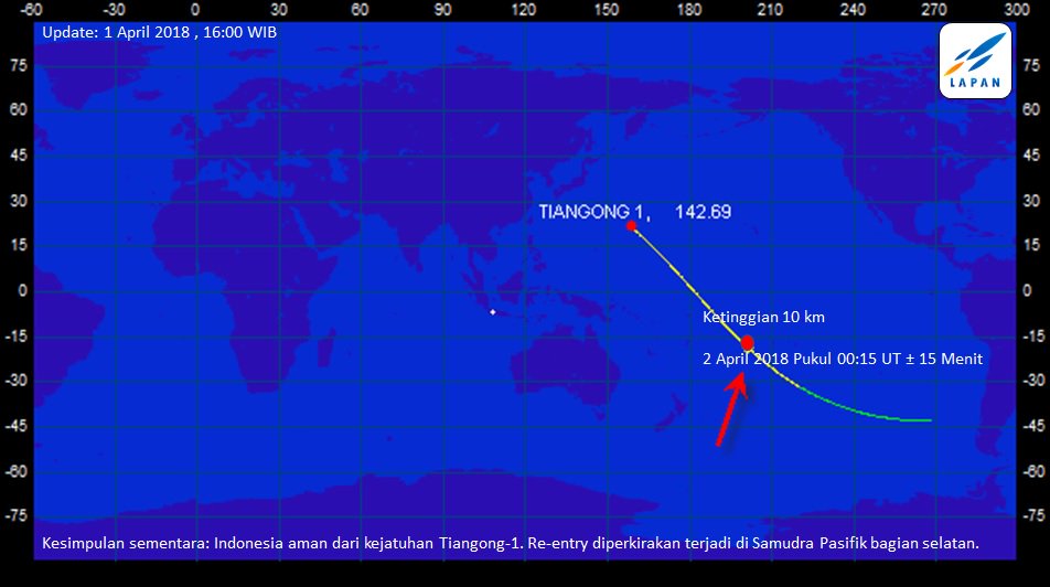 PEKANBARU, INFORIAU.co - Stasiun ruang angkasa milik China, Tiangong-1, dikonfirmasi telah jatuh kembali ke Bumi. Menurut China Manned Space Engineering Office (CMSEO), sampah luar angkasa tersebut masuk kembali atmosfer Bumi sekitar pukul 07.16 WIB pagi pada hari Senin (2/4).